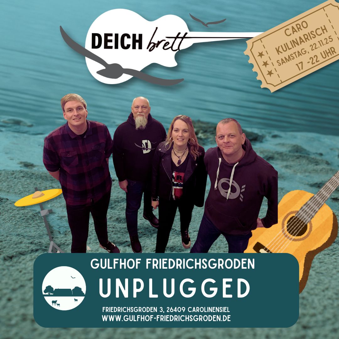 Auf dem Gulfhof Friedrichsgroden serviert an diesem Abend die ostfriesische Rockband Deichbrett selbstgeschriebene Lieder aus Ihren Alben. Sie spielen UNPLUGGED.